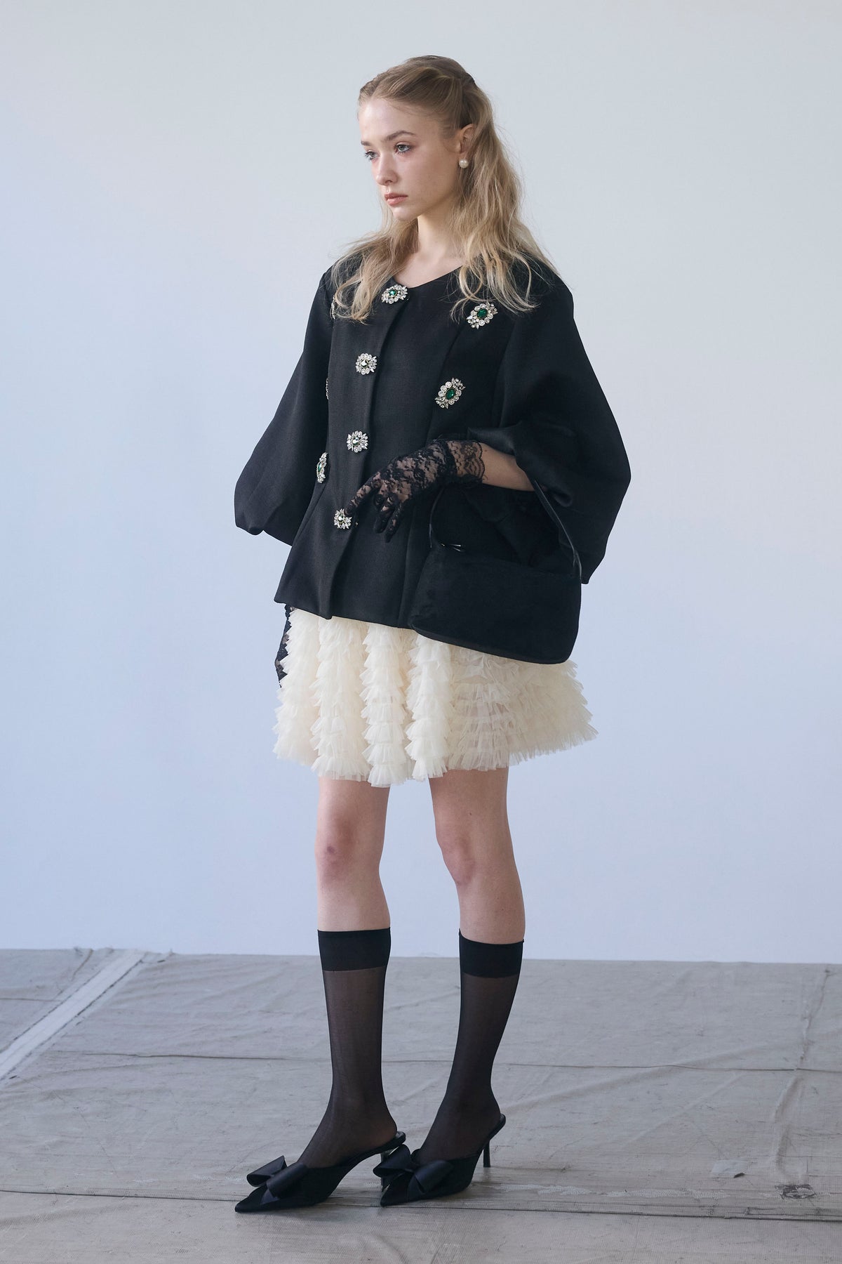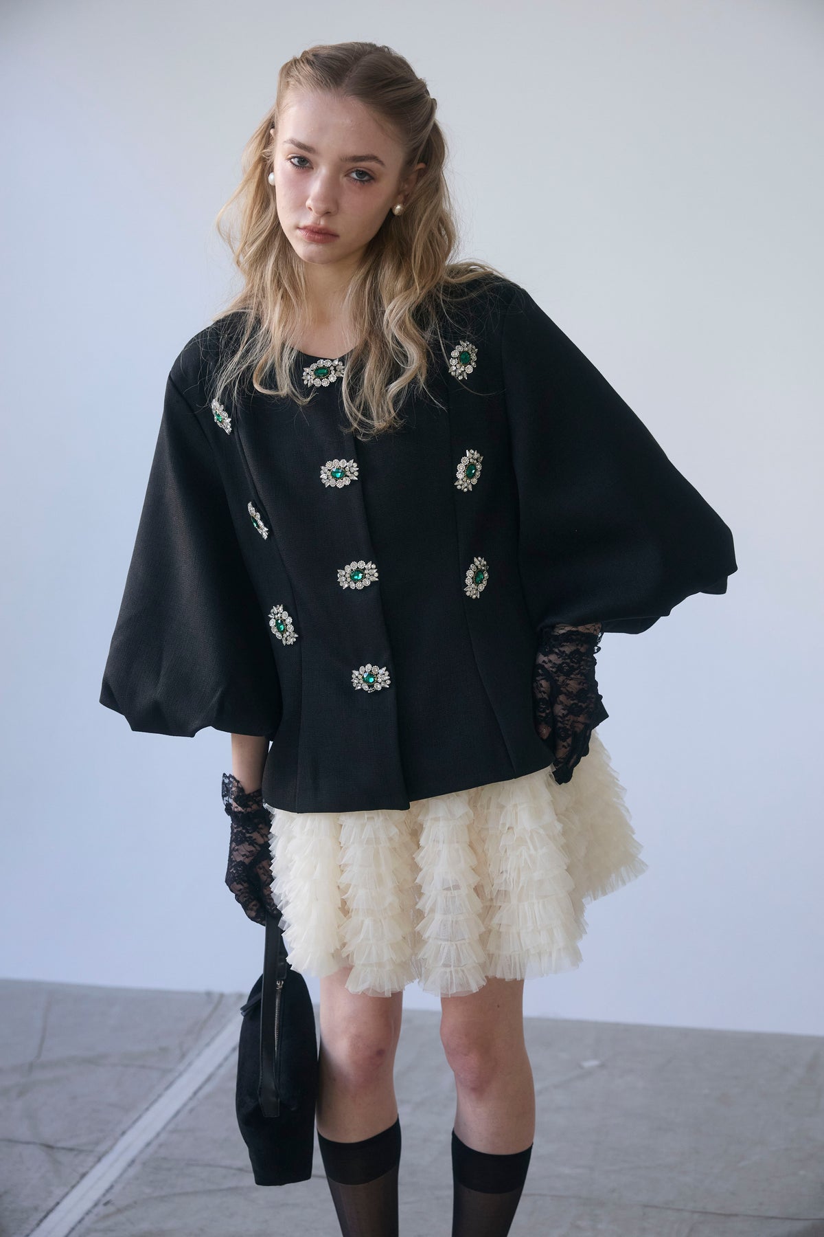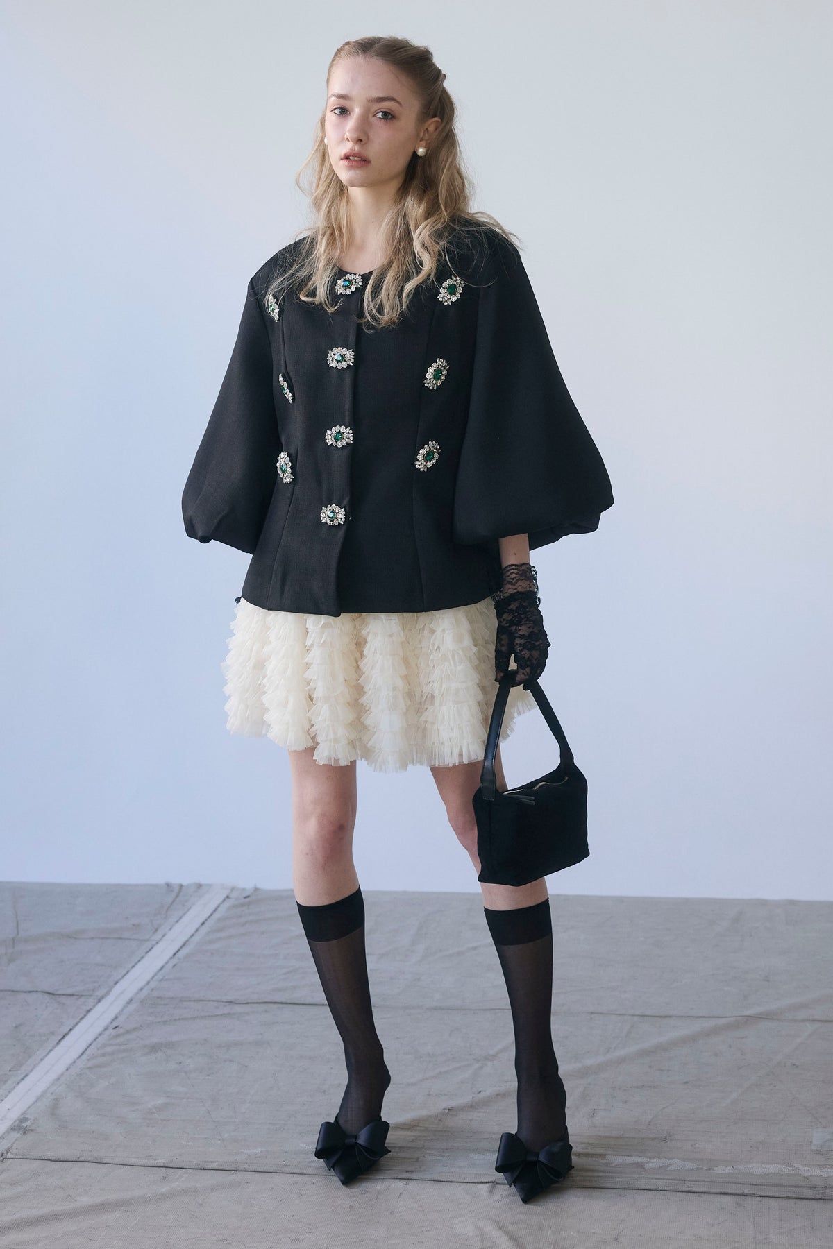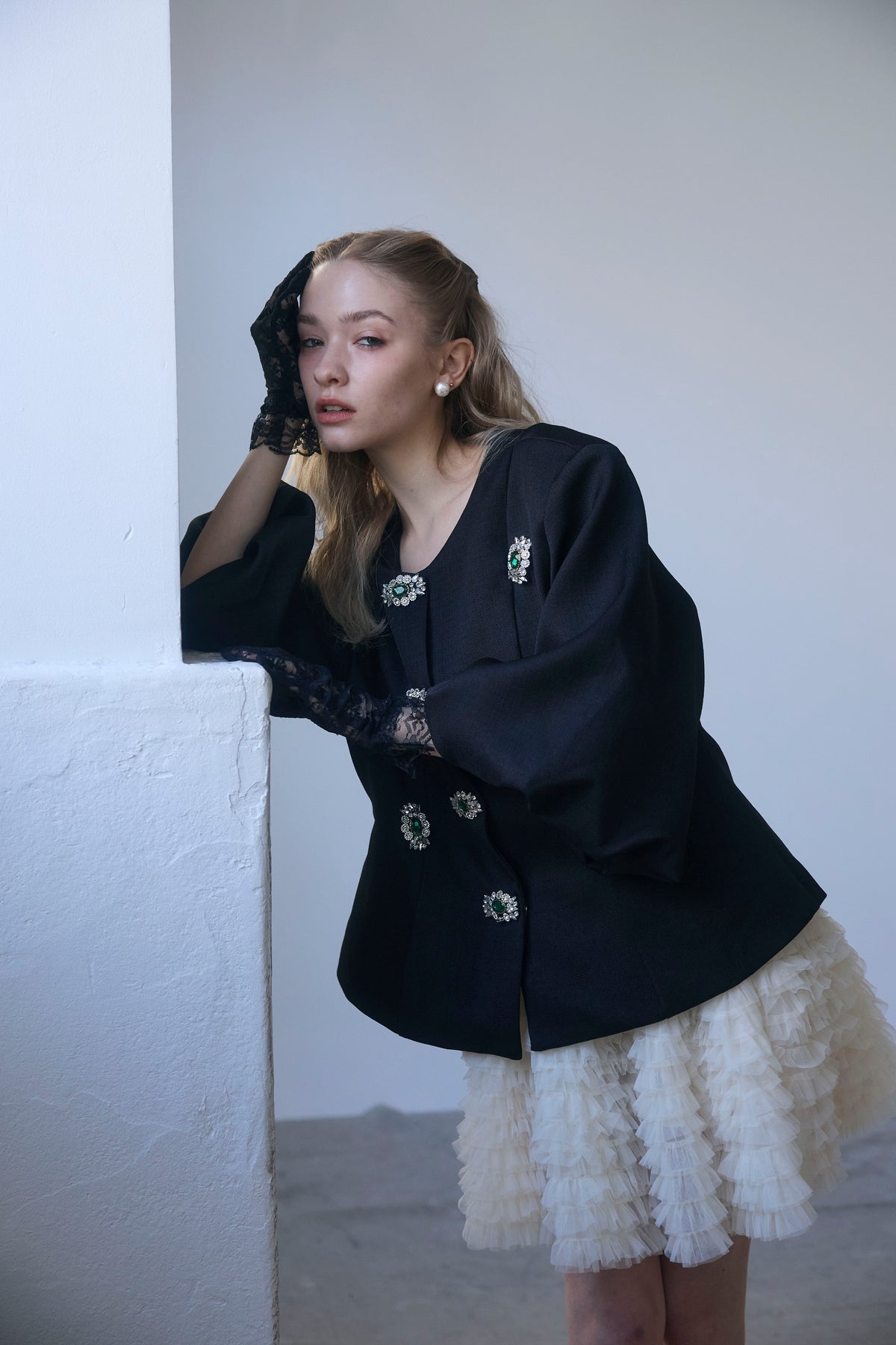 宝石のようなビジューボタンを贅沢にあしらった、クラシカルなノーカラージャケット。 パネルラインで仕立てた立体的なシルエットが、ウエストをすっきりと見せ、羽織るだけで美しいボディラインを演出します。 ふんわりとしたボリュームスリーブは、手元を華奢に見せるフェミニンなアクセント。 シンプルなボトムスと合わせるだけで、日常が特別になる主役級の一着です。