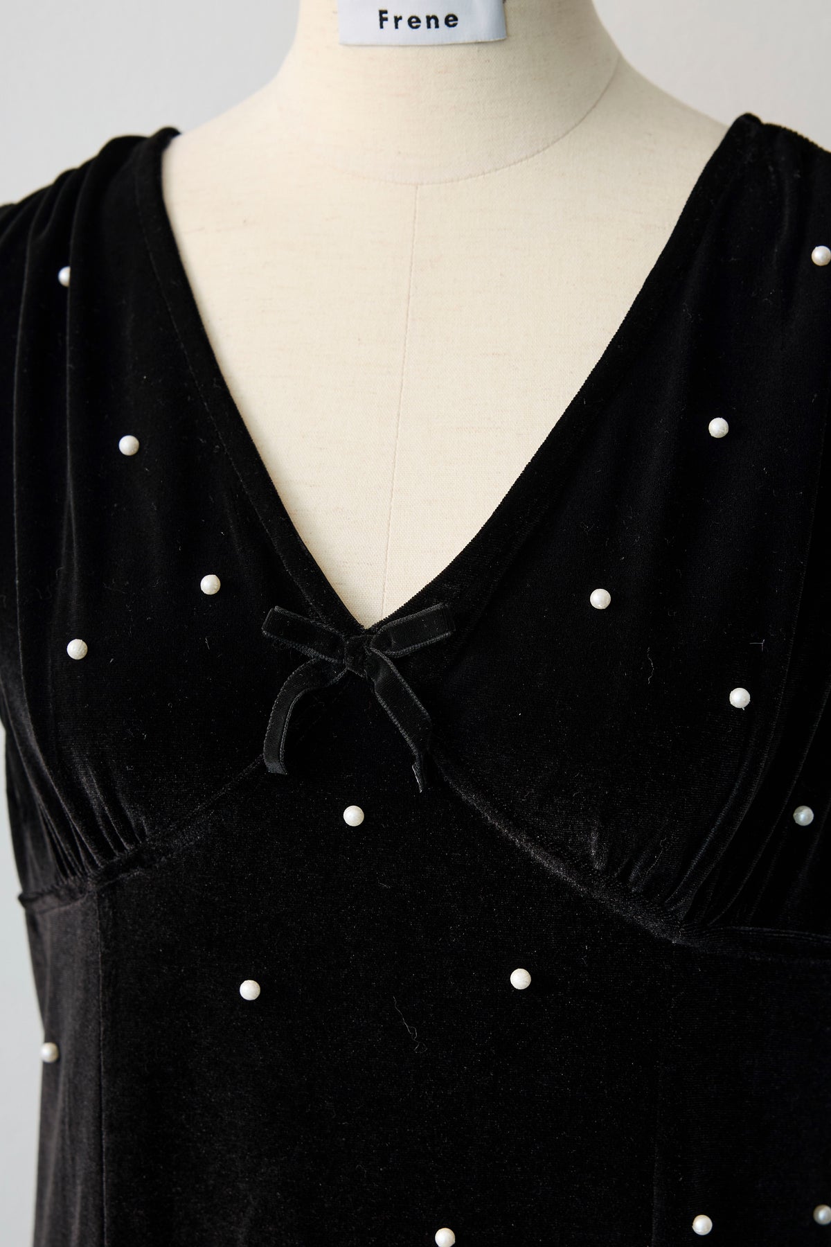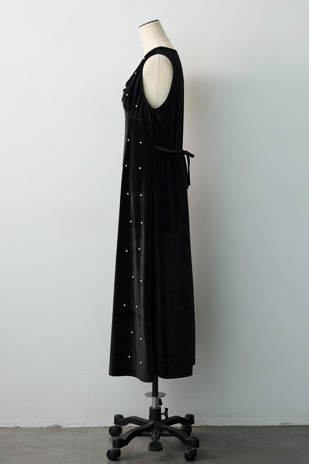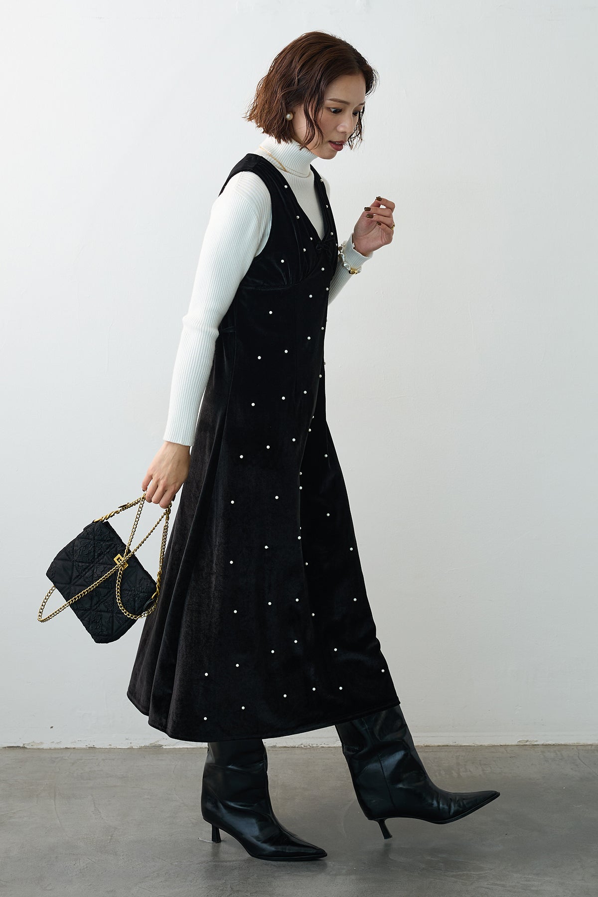 艶やかなベロア素材に、パールを贅沢に散りばめた華やかなロングワンピース。 深めのVネックが顔周りをすっきりとシャープに見せ、タートルネックやブラウスとのレイヤードスタイルを上品に引き立てます。 胸元にあしらわれた小さなリボンが、大人の装いにさりげない愛らしさをプラス。 バックスタイルにはウエストを調整できるリボンが付いており、シルエットに変化をつけて楽しめるのも魅力です。