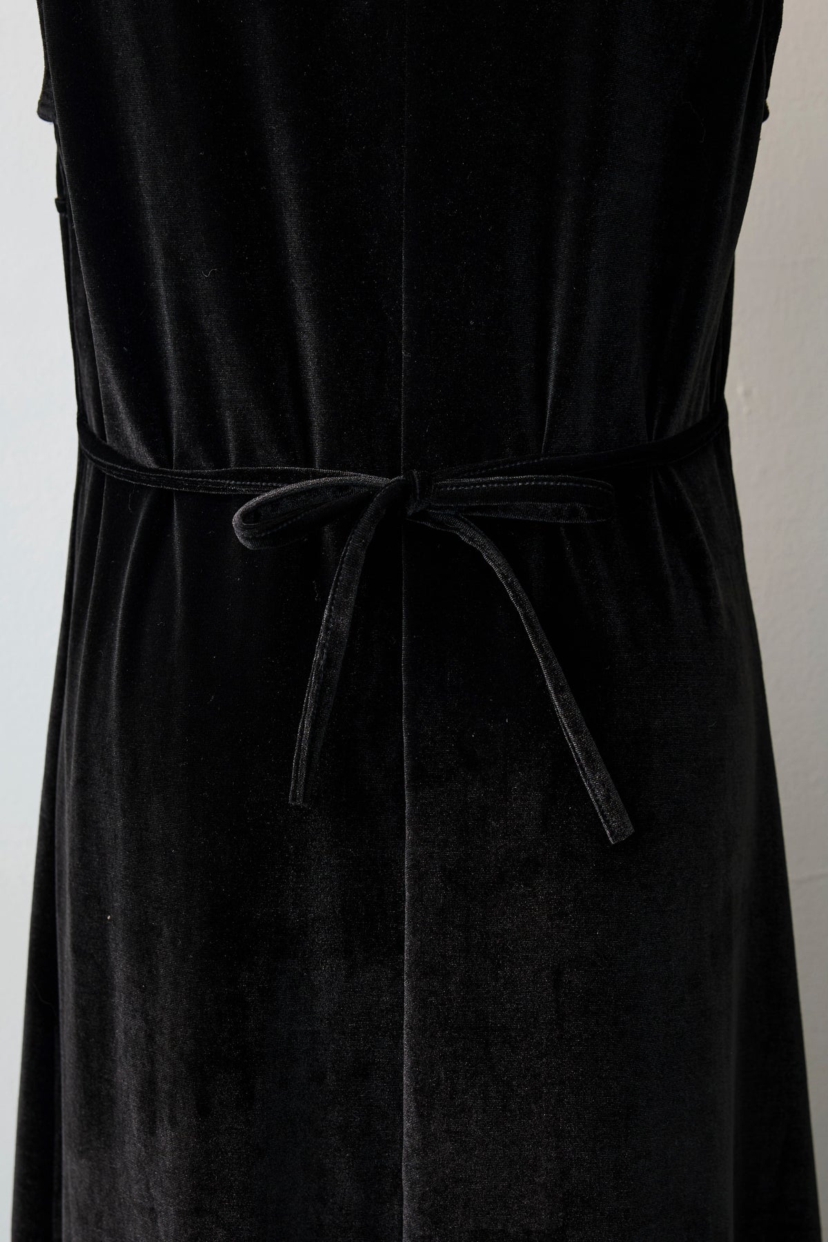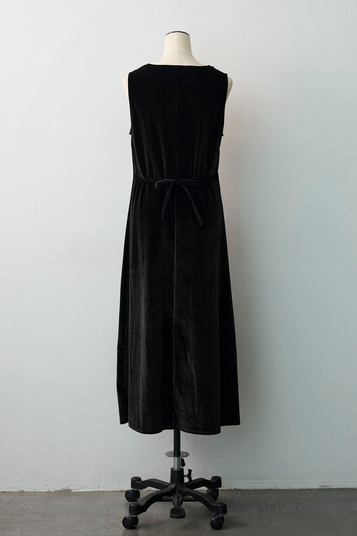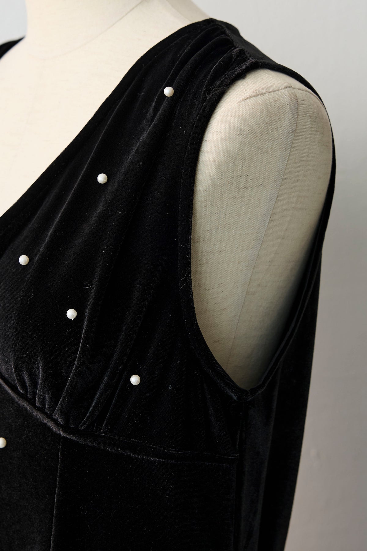 艶やかなベロア素材に、パールを贅沢に散りばめた華やかなロングワンピース。 深めのVネックが顔周りをすっきりとシャープに見せ、タートルネックやブラウスとのレイヤードスタイルを上品に引き立てます。 胸元にあしらわれた小さなリボンが、大人の装いにさりげない愛らしさをプラス。 バックスタイルにはウエストを調整できるリボンが付いており、シルエットに変化をつけて楽しめるのも魅力です。