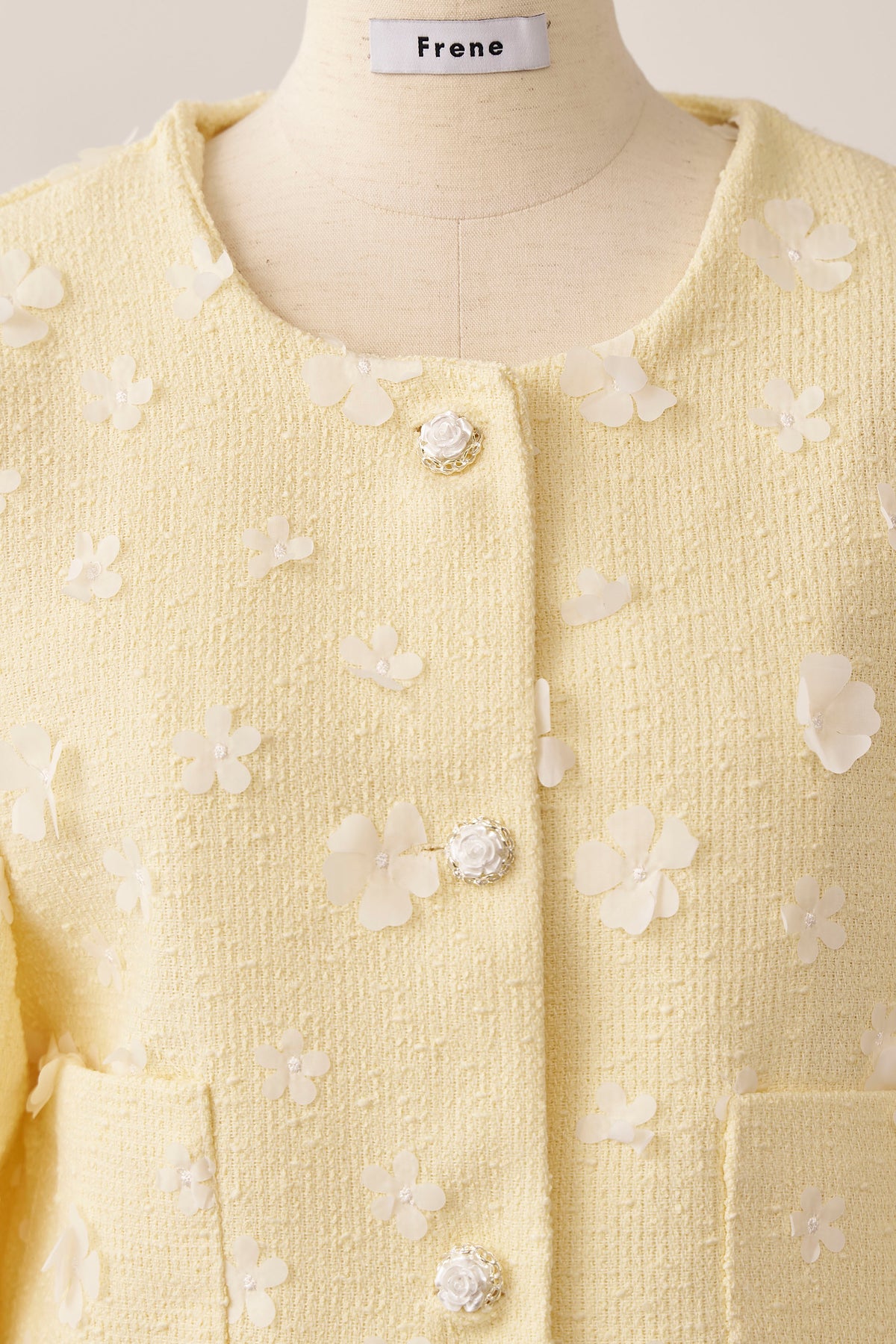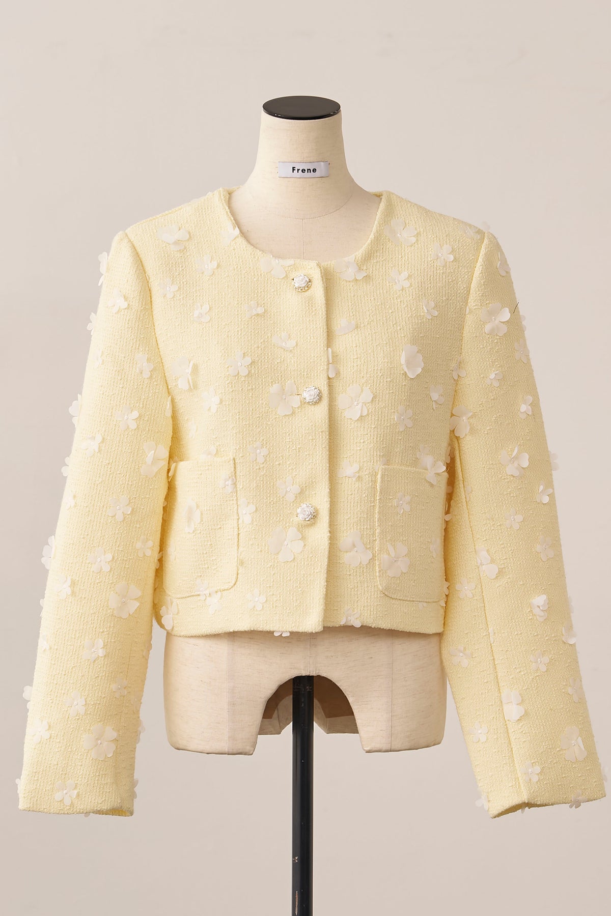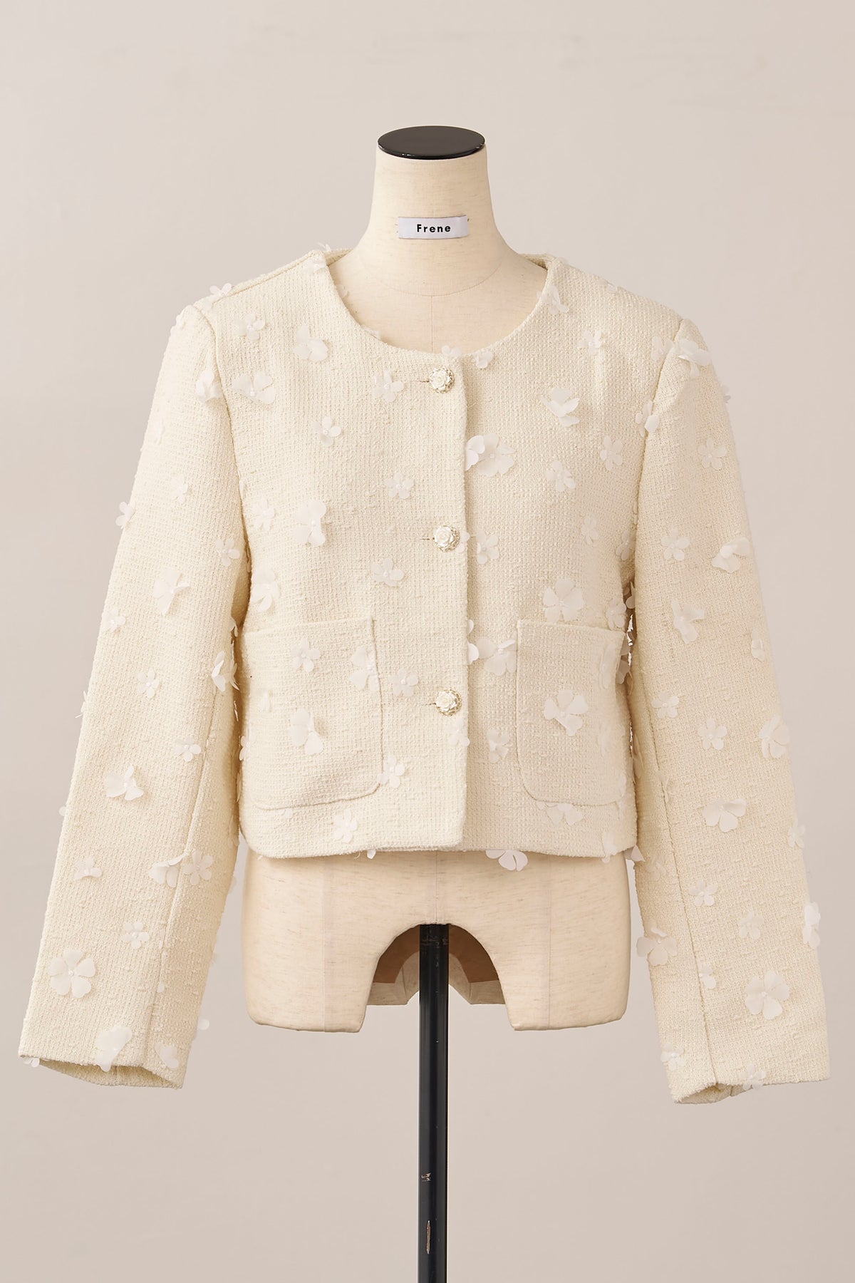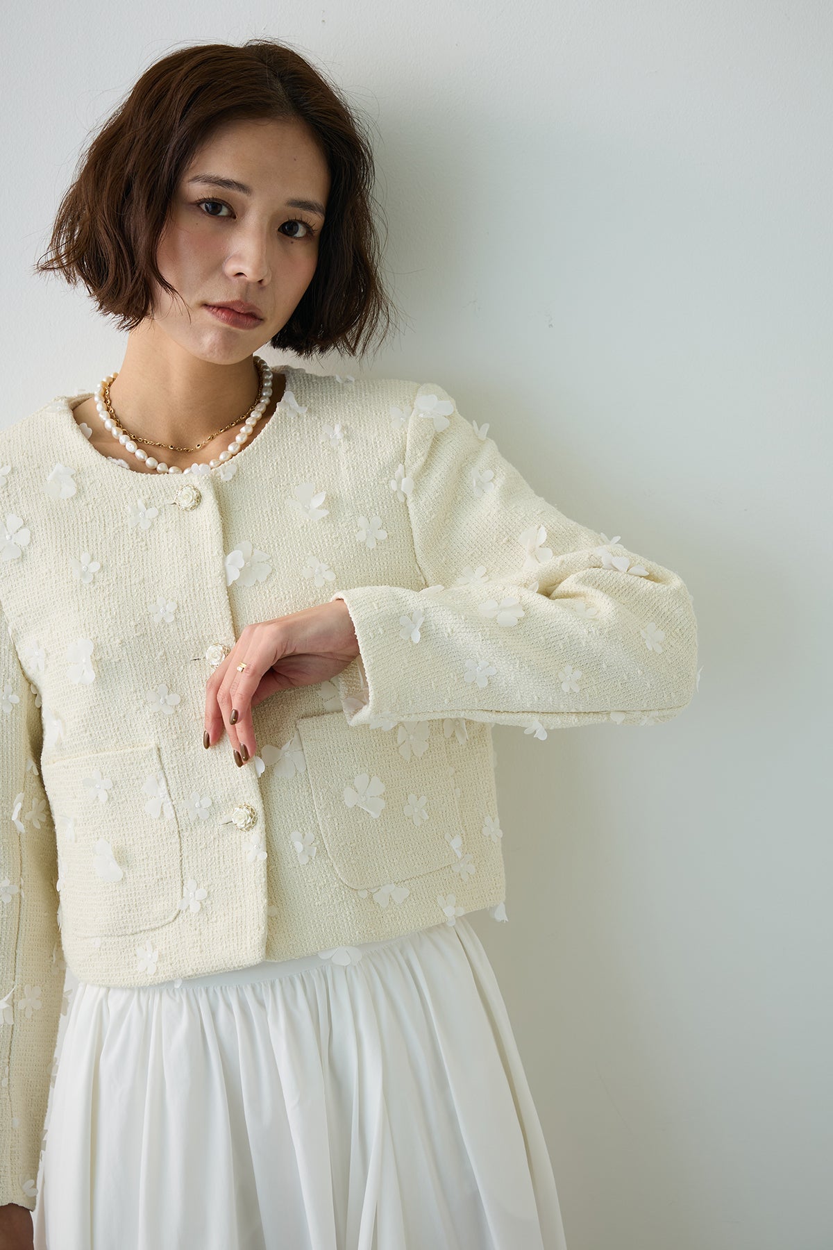 立体的な小花モチーフを贅沢に散りばめた、春のときめきを纏うツイードジャケット。 同色のフラワー装飾が主張しすぎず、大人の女性に似合う上品な甘さを演出します。 ジュエリーのようなビジューボタンがアクセントになり、ノーカラーで顔周りもすっきりとした印象に。 デニムで着崩せばデイリーに、スカートを合わせれば華やかな席にも映える、春の主役級アウターです。