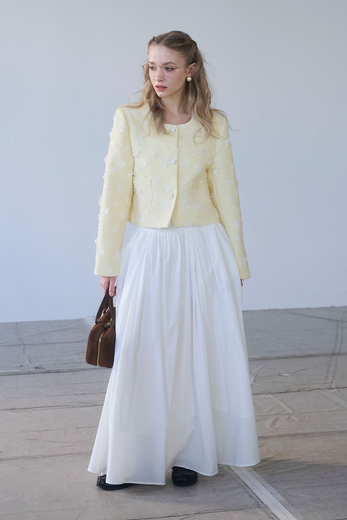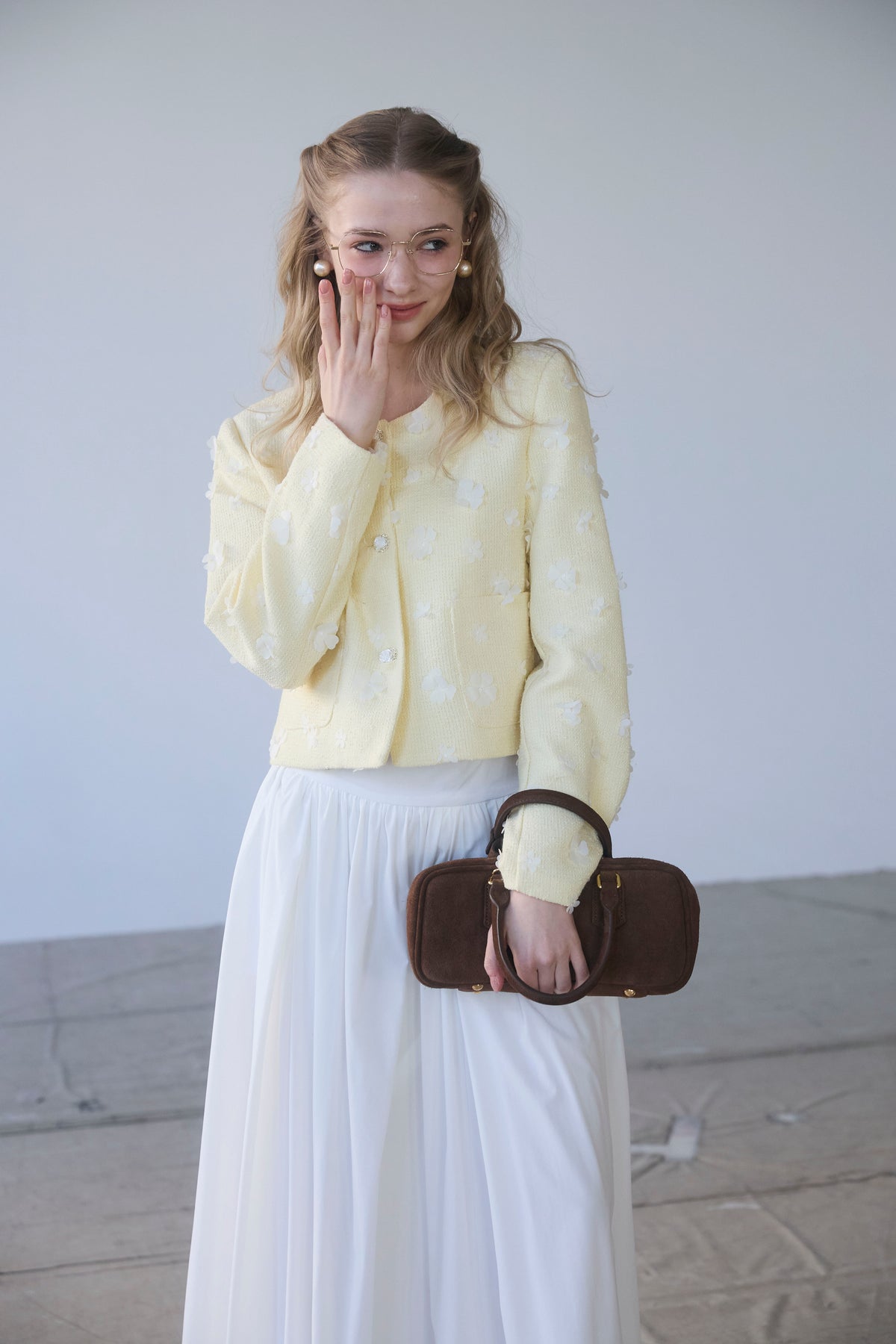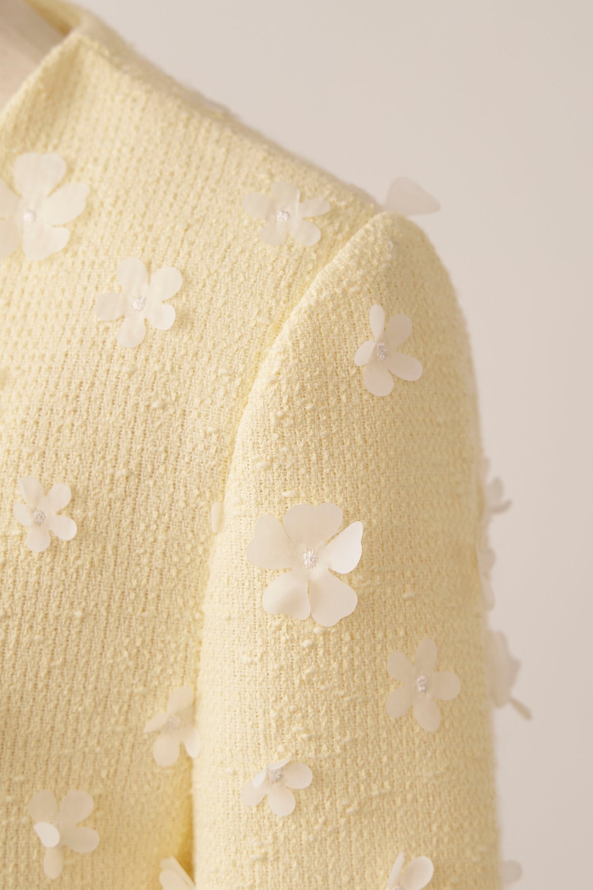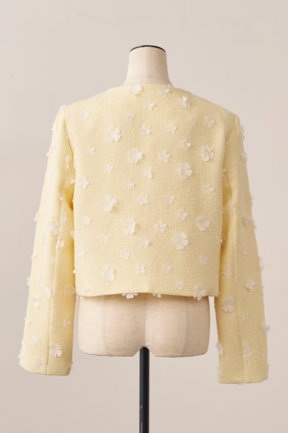 立体的な小花モチーフを贅沢に散りばめた、春のときめきを纏うツイードジャケット。 同色のフラワー装飾が主張しすぎず、大人の女性に似合う上品な甘さを演出します。 ジュエリーのようなビジューボタンがアクセントになり、ノーカラーで顔周りもすっきりとした印象に。 デニムで着崩せばデイリーに、スカートを合わせれば華やかな席にも映える、春の主役級アウターです。