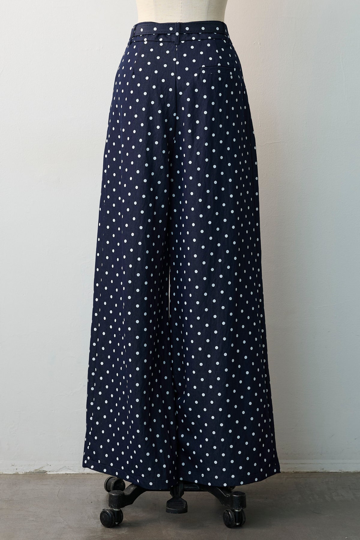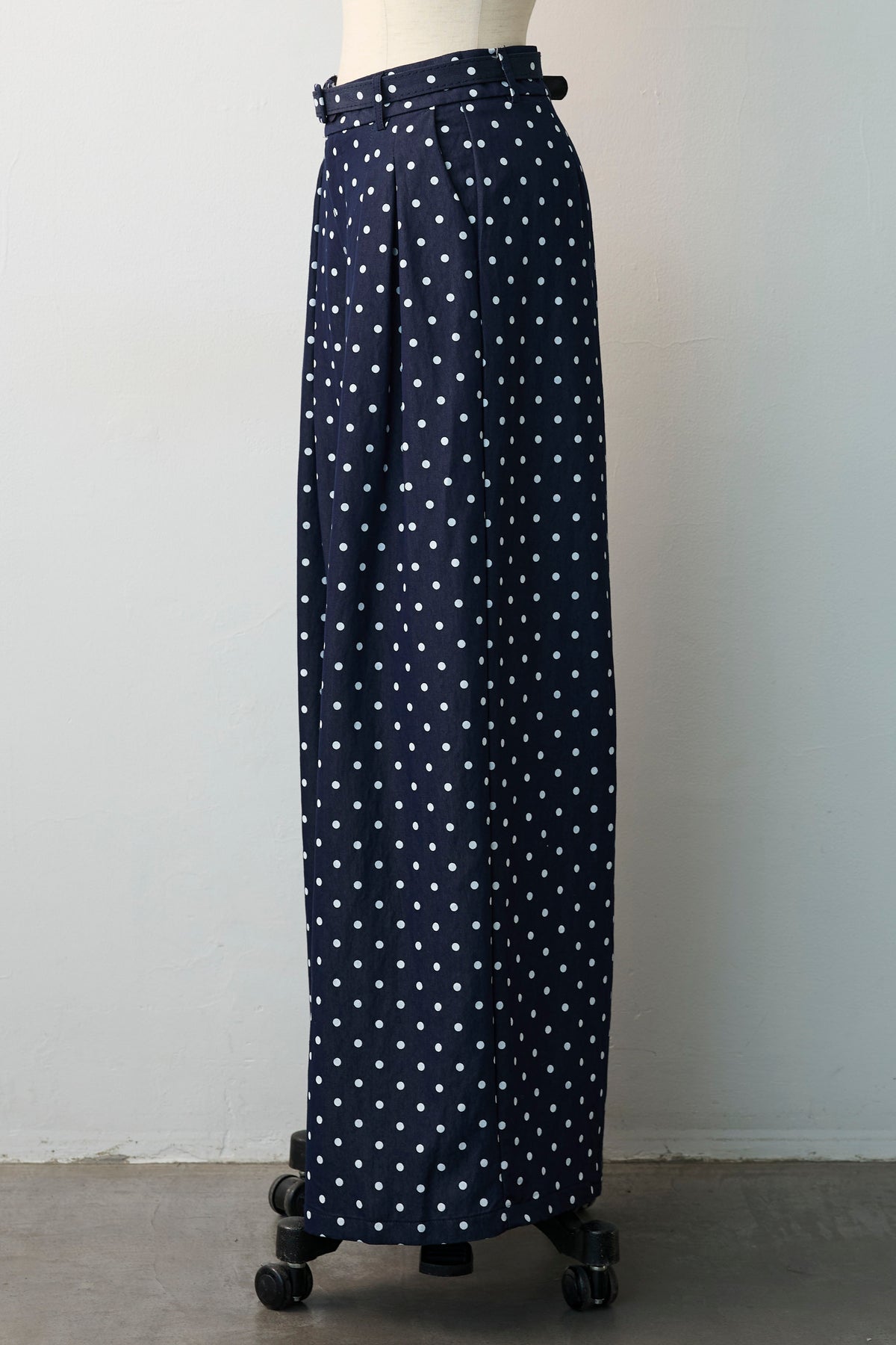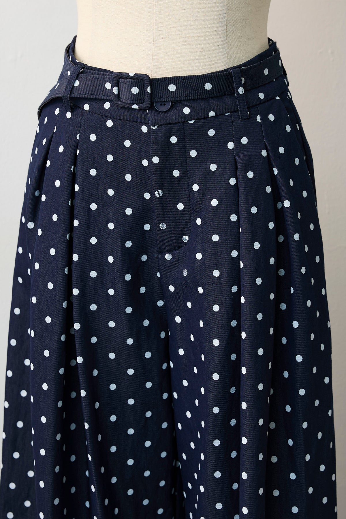 カジュアルなデニム素材に、小さなドット柄を散りばめた、レトロで愛らしいワイドパンツ。 ウエストに施した深めのタックが立体的なシルエットを作り出し、まるでロングスカートのような優雅な揺れ感を楽しめます。 ベルトがセットになっており、キュッとウエストをマークすればメリハリのある美スタイルが完成。 存在感のある一本なので、シンプルなトップスやショート丈のアウターと合わせるだけで、こなれた大人のフレンチシックスタイルが決まります。