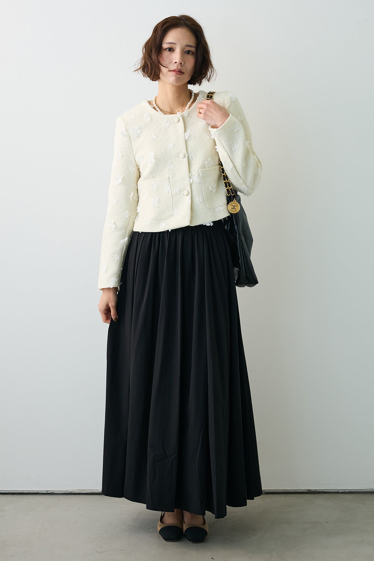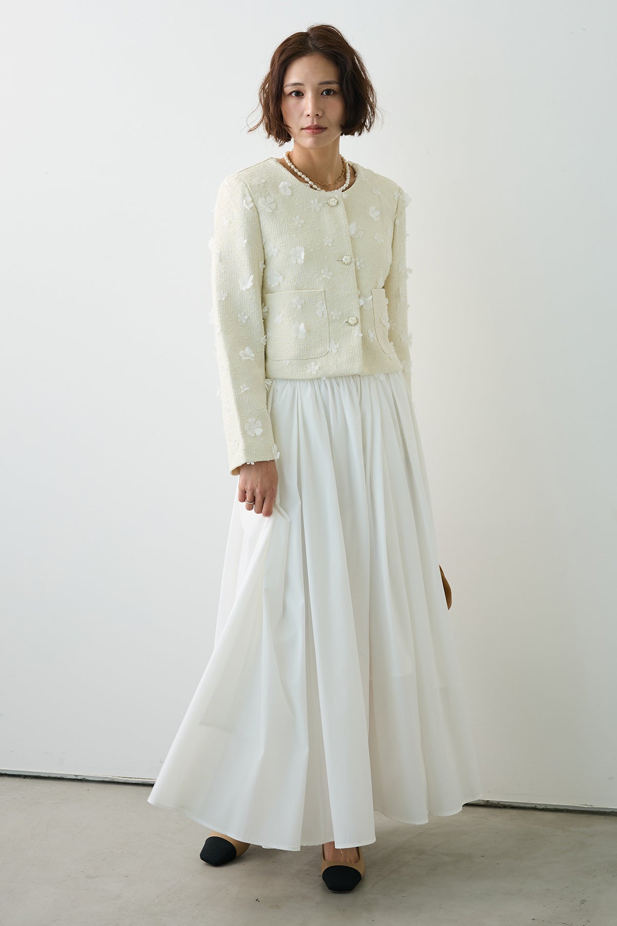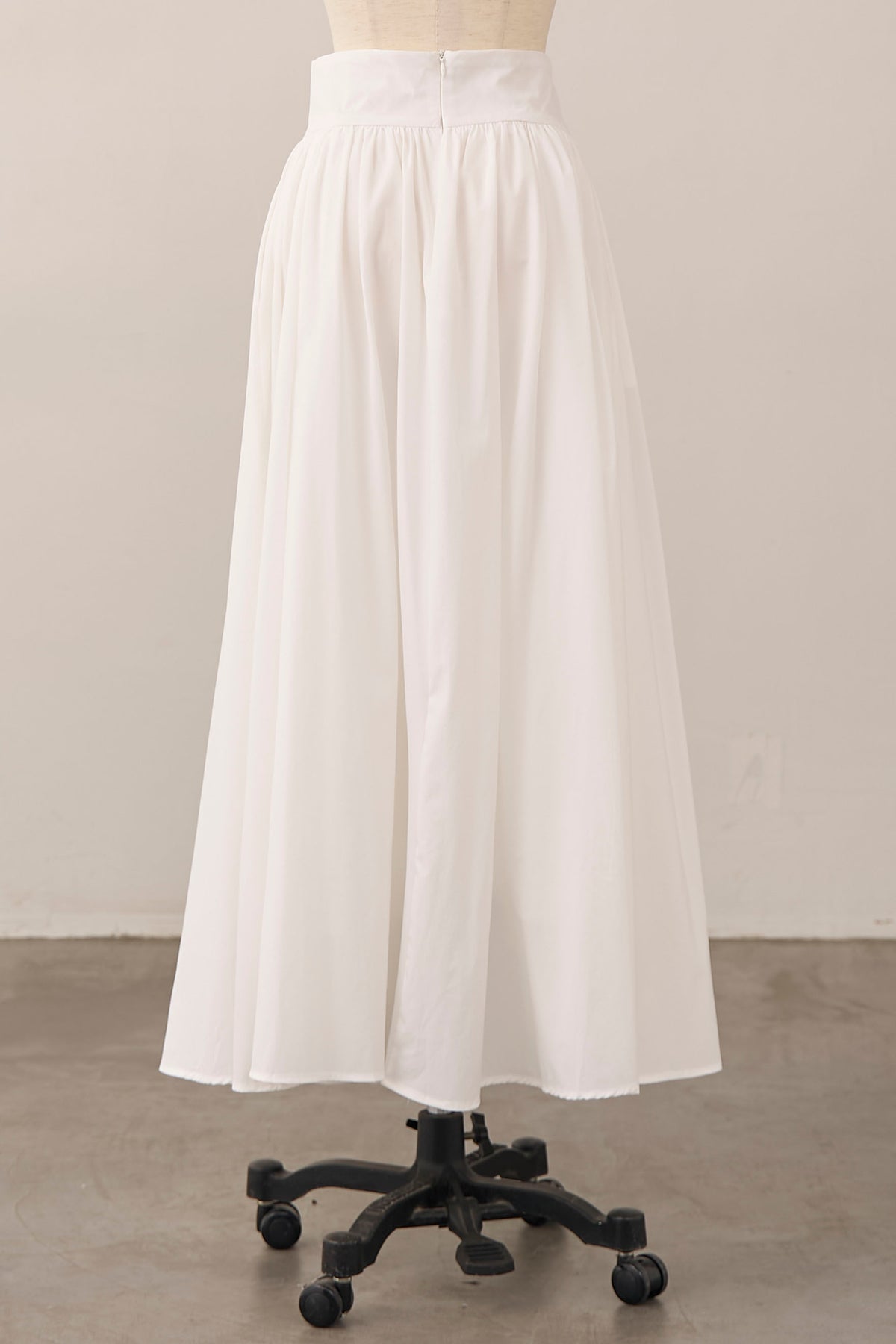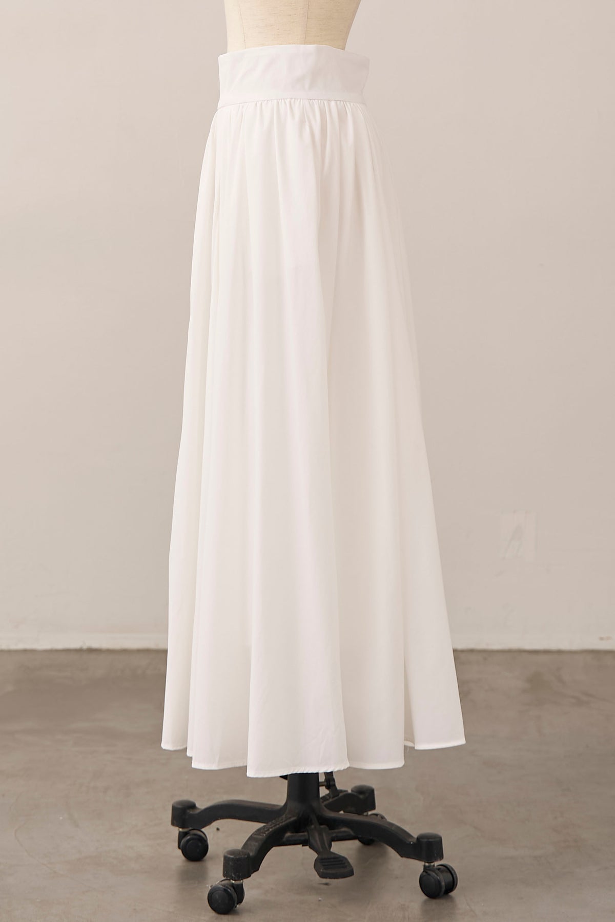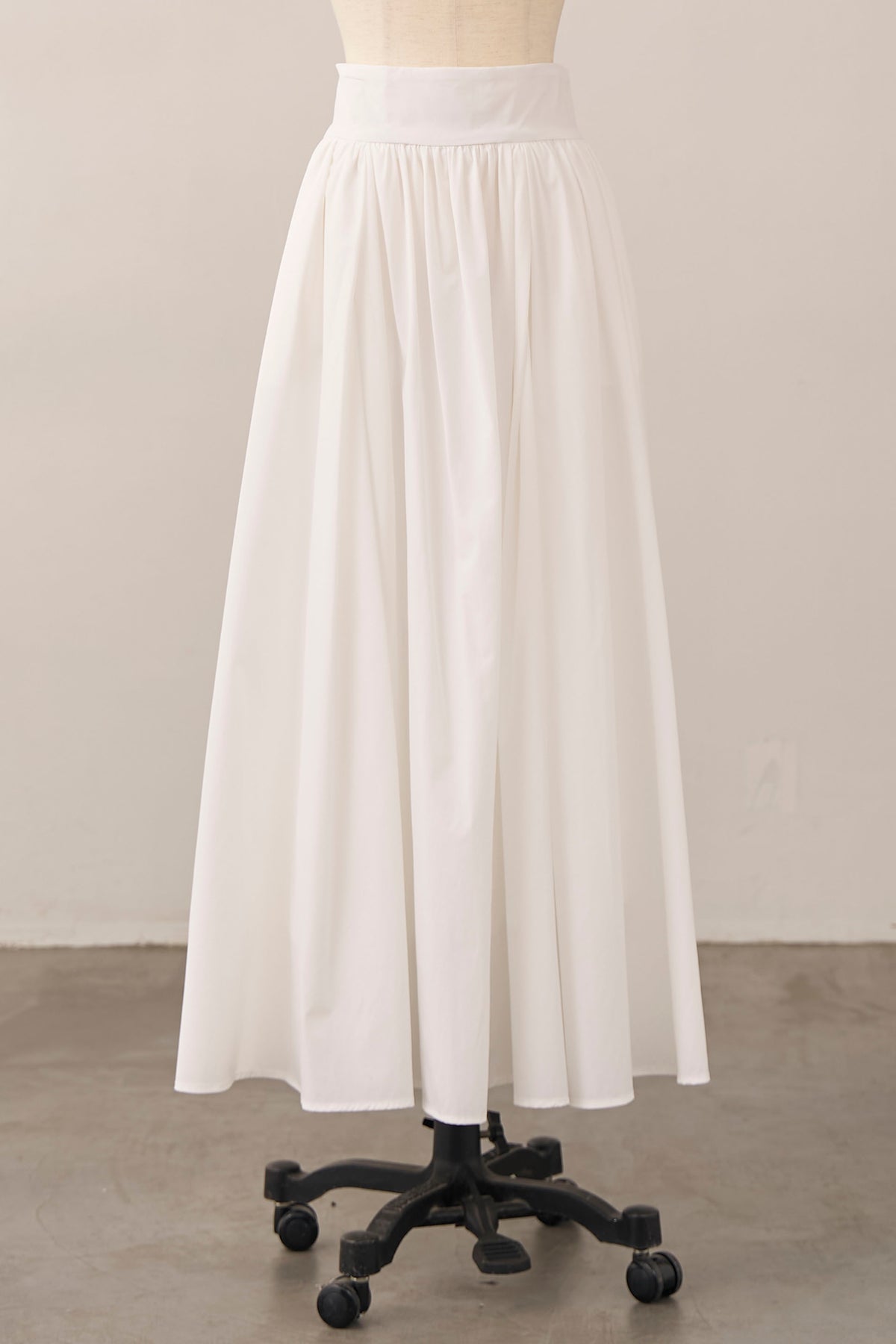 たっぷりと施されたギャザーが、歩くたびにエアリーな余韻を残すロングスカート。 コットンのようなナチュラルな風合いが、気負わない大人の抜け感を演出します。 広がりすぎない計算されたAラインシルエットは、ショート丈のジャケットやコンパクトなトップスとも相性抜群。 シンプルながらも存在感があり、春のワードローブに欠かせない万能な一着です。
