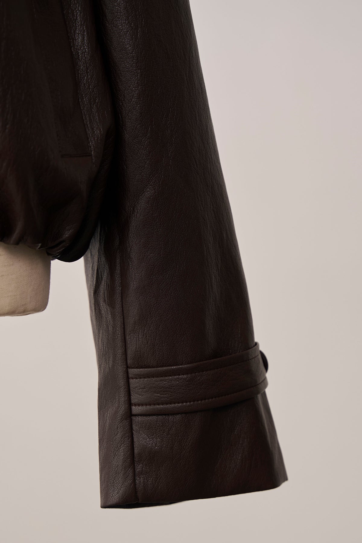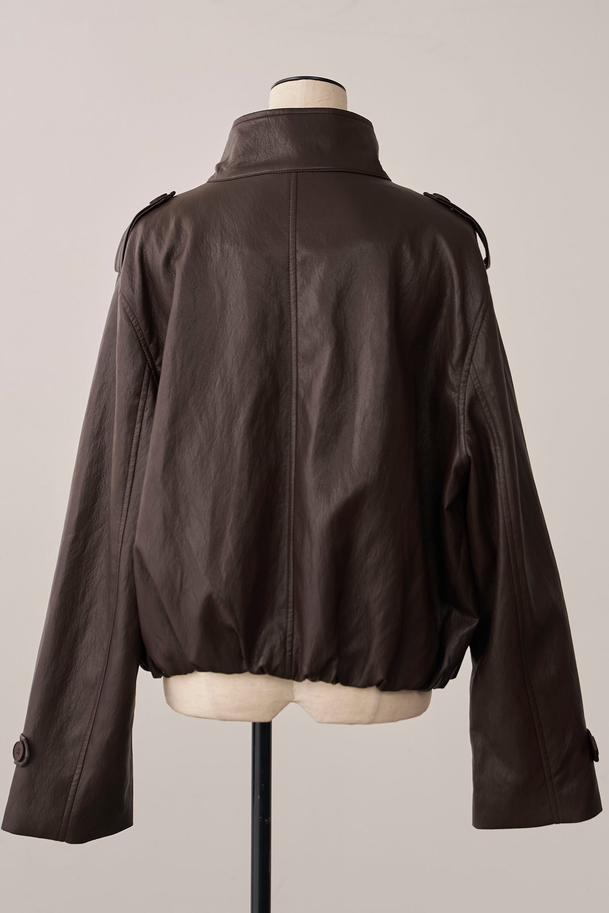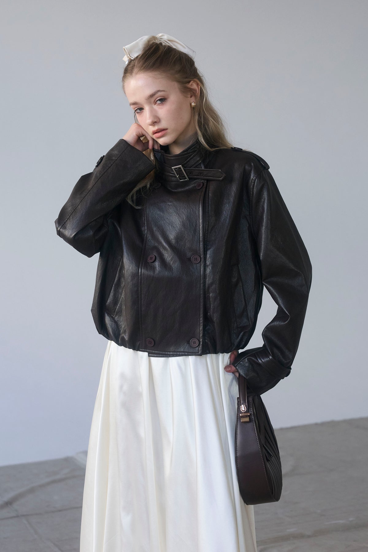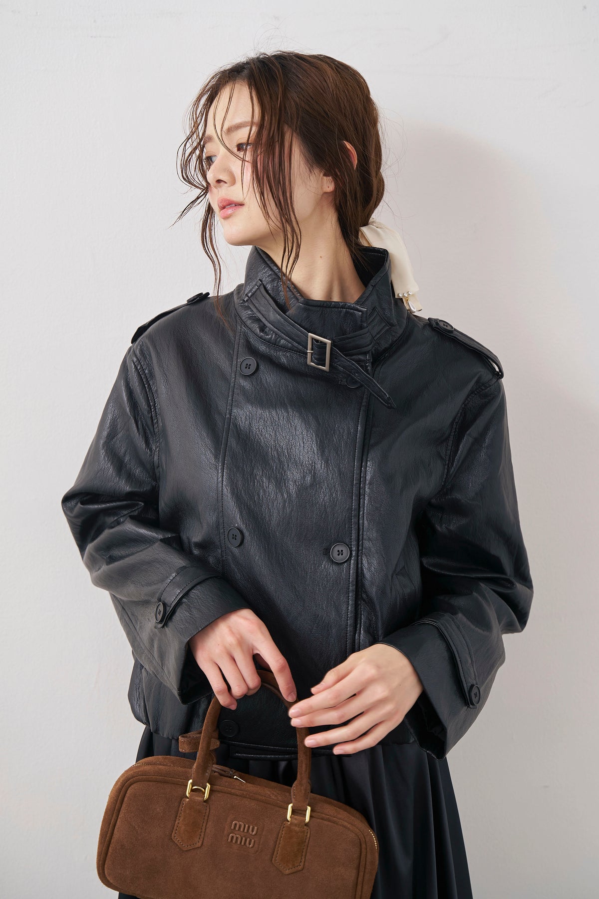 モードなスパイスを効かせた、レザーライククロップドジャケット。 首元のベルトを留めたスタンドカラーなら、都会的でシャープな印象に。 視線を上に集めるショート丈は、ボリュームスカートとも好相性で、脚長効果を約束します。 甘めな装いの引き締め役として活躍する、洗練された辛口アウターです。