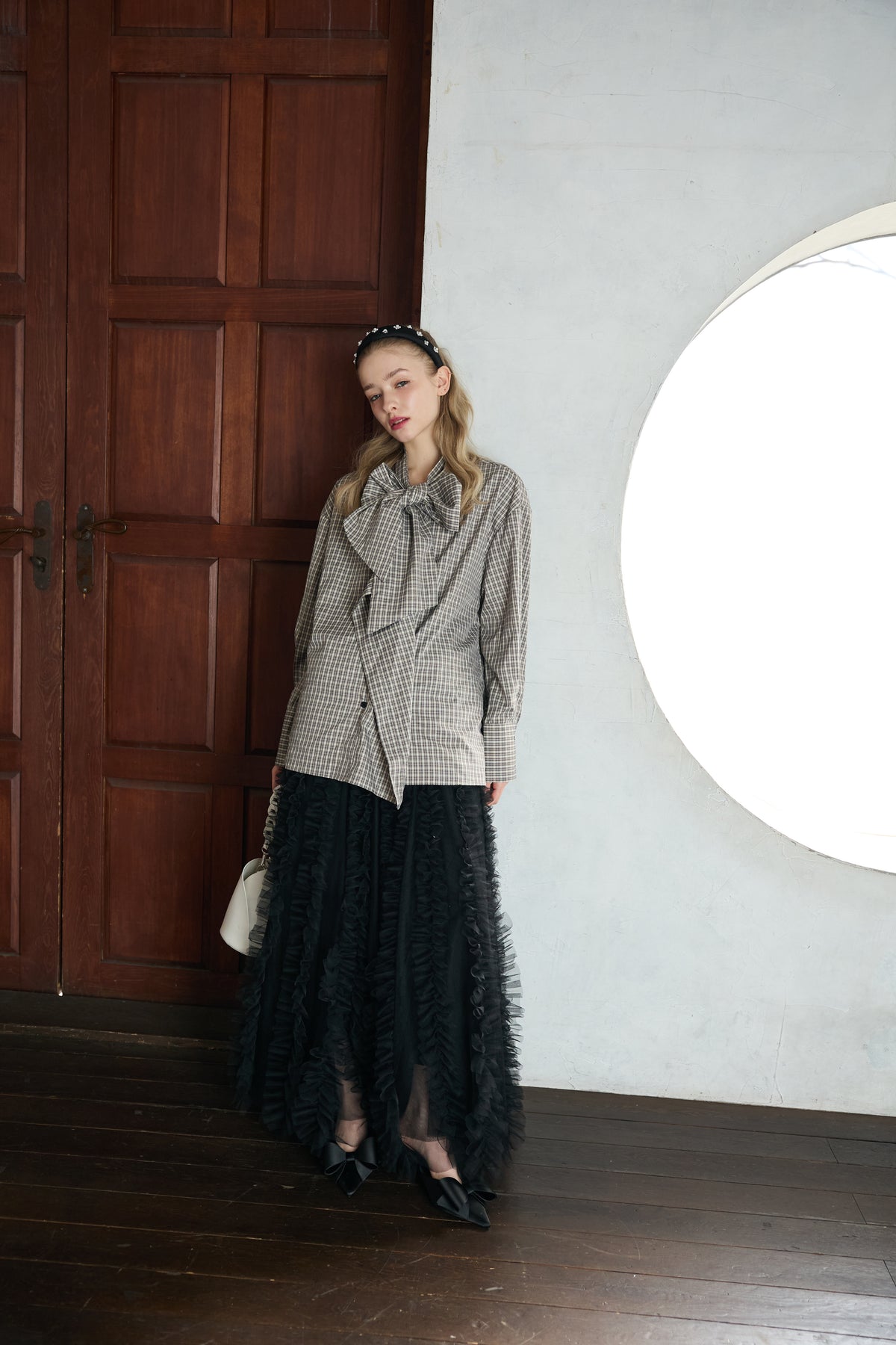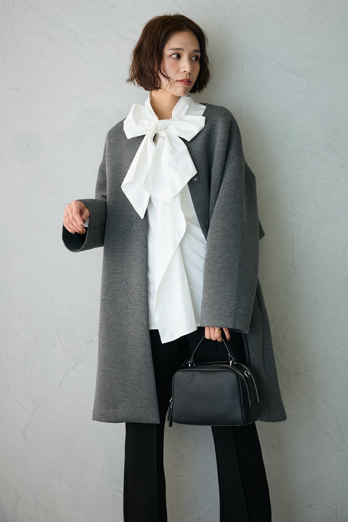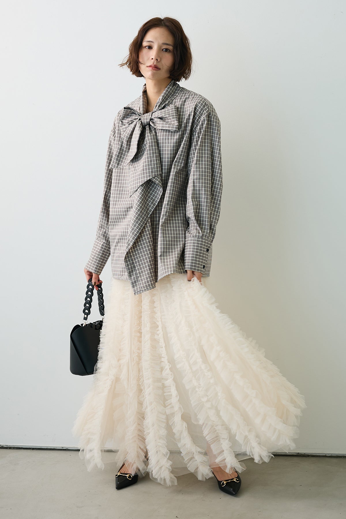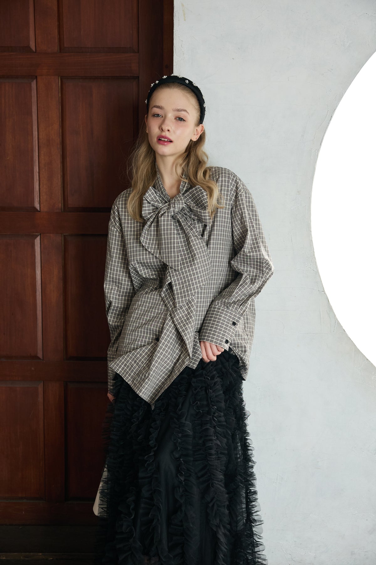 顔周りを華やかに彩るビッグボウタイと、アシンメトリーなデザインが融合したシャツ。 構築的なシルエットがモードな感性を刺激し、甘くなりすぎない大人のバランスを保ちます。 リボンは結び方次第で印象が変わり、垂らせばこなれた大人の余裕を演出。 シンプルなボトムスと合わせるだけで、洗練された着こなしが完成する主役級の一枚です。