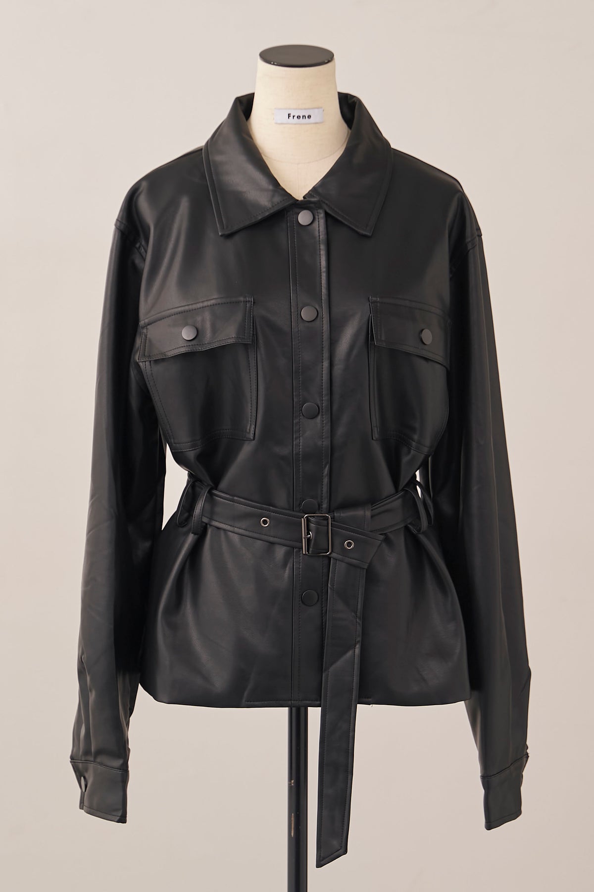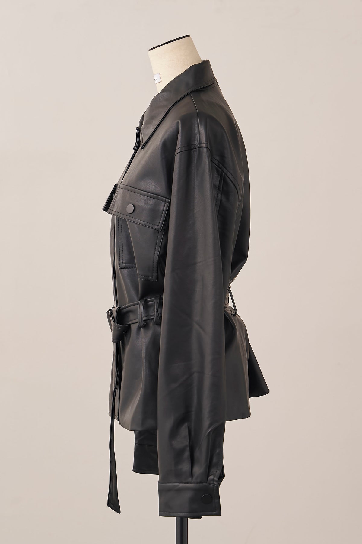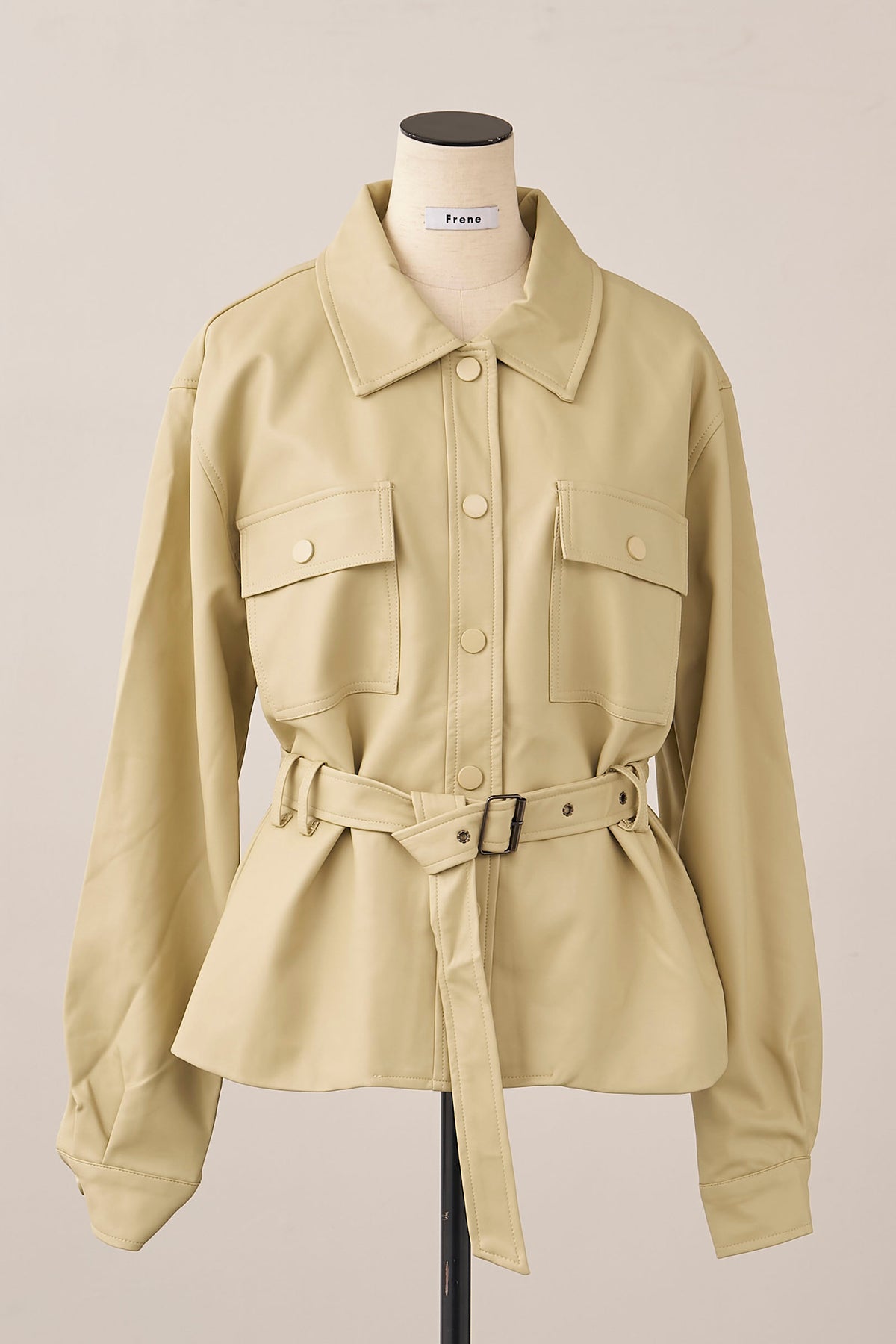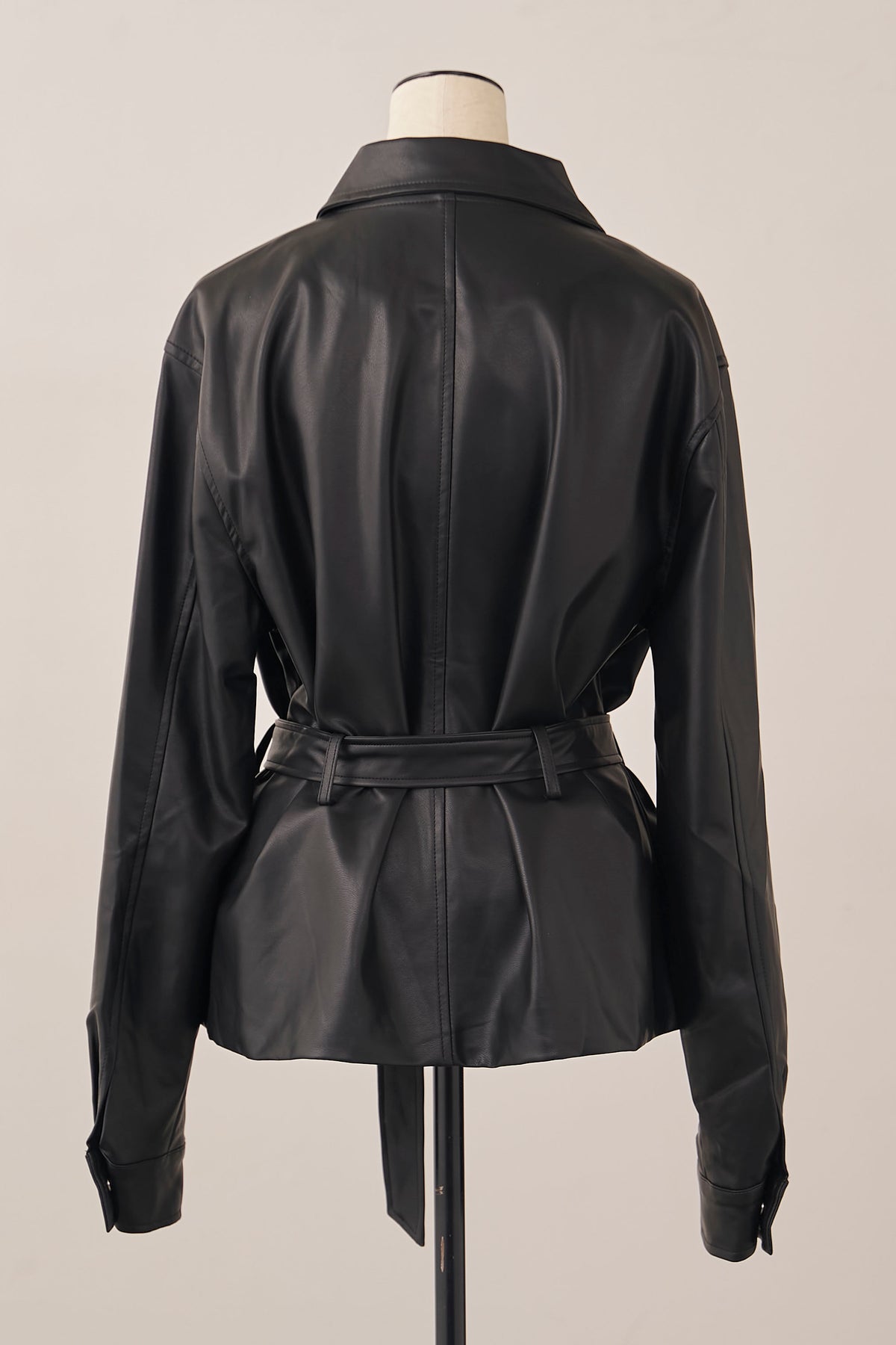 しなやかなレザーライク素材が、大人の辛口モードを演出するジャケット。 付属のベルトでウエストをきゅっと絞れば、メリハリのある美しいXラインが完成し、スタイルアップ効果は抜群です。 胸元の大きなフラップポケットが視線を上げ、デザインのほどよいスパイスに。 甘めなフリルブラウスやミニボトムと合わせれば、感度の高い洗練された甘辛スタイルが楽しめます。