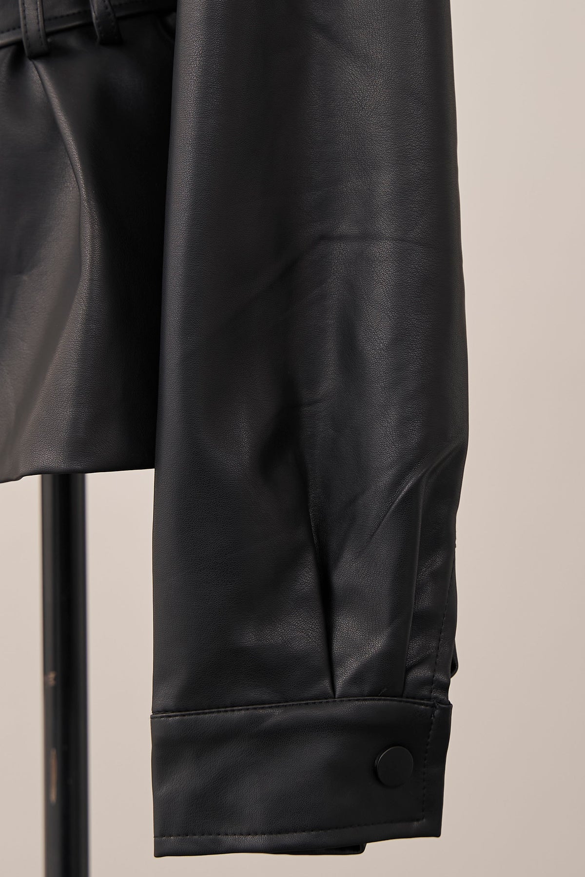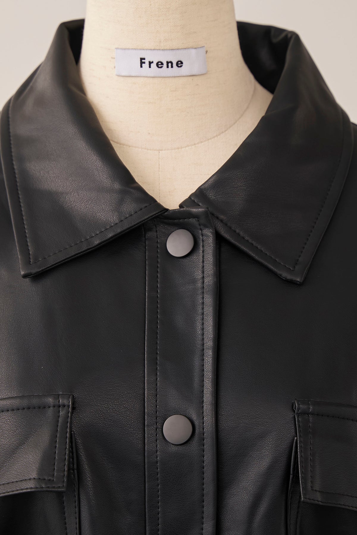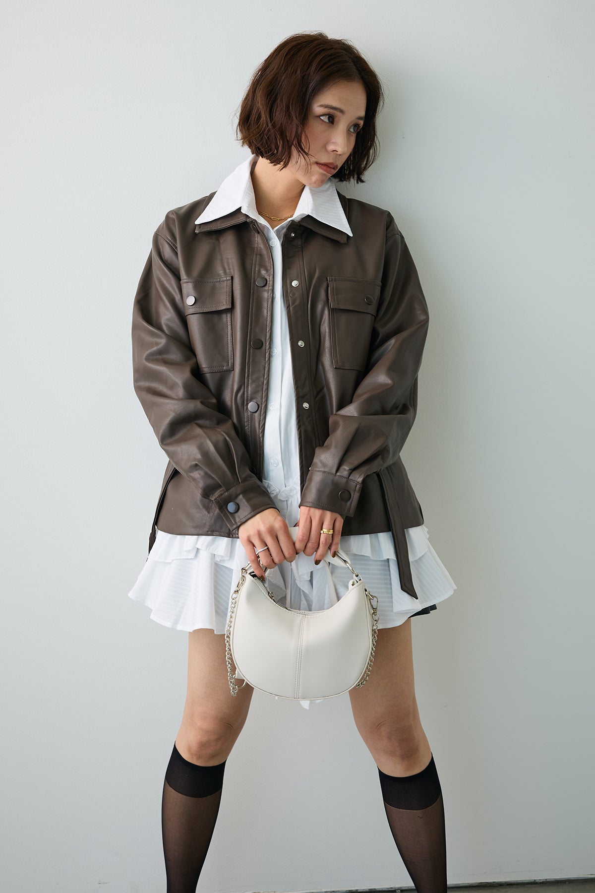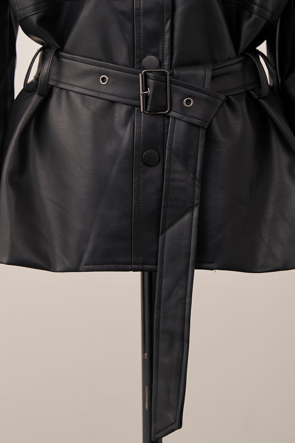 しなやかなレザーライク素材が、大人の辛口モードを演出するジャケット。 付属のベルトでウエストをきゅっと絞れば、メリハリのある美しいXラインが完成し、スタイルアップ効果は抜群です。 胸元の大きなフラップポケットが視線を上げ、デザインのほどよいスパイスに。 甘めなフリルブラウスやミニボトムと合わせれば、感度の高い洗練された甘辛スタイルが楽しめます。